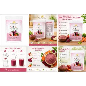 - ABC powder combines Apple, Beetroot, and Carrot — three naturally nutrient-dense fruits and vegetables